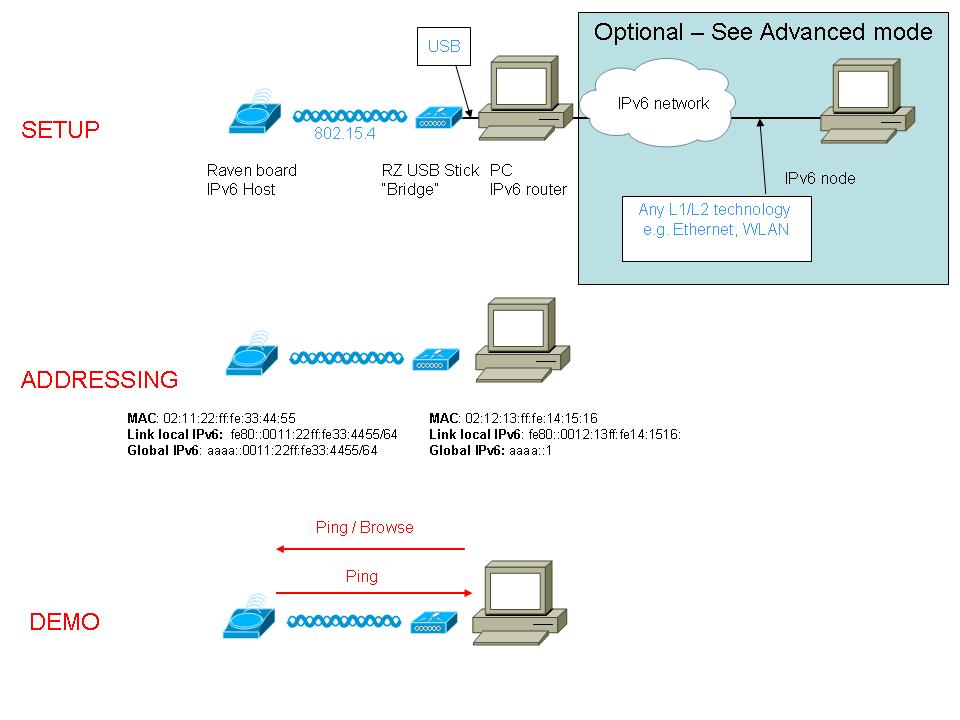 There is no widely available 802.15.4 and 6lowpan stack for PCs. As a temporary solution and to be able to connect IPv6 hosts such as RAVEN boards to IP networks, we implemented a "bridge" function on the RZ USB Stick. The RZ USB stick bridges 802.15.4 packets to Ethernet (The Ethernet interface is emulated on the USB port).